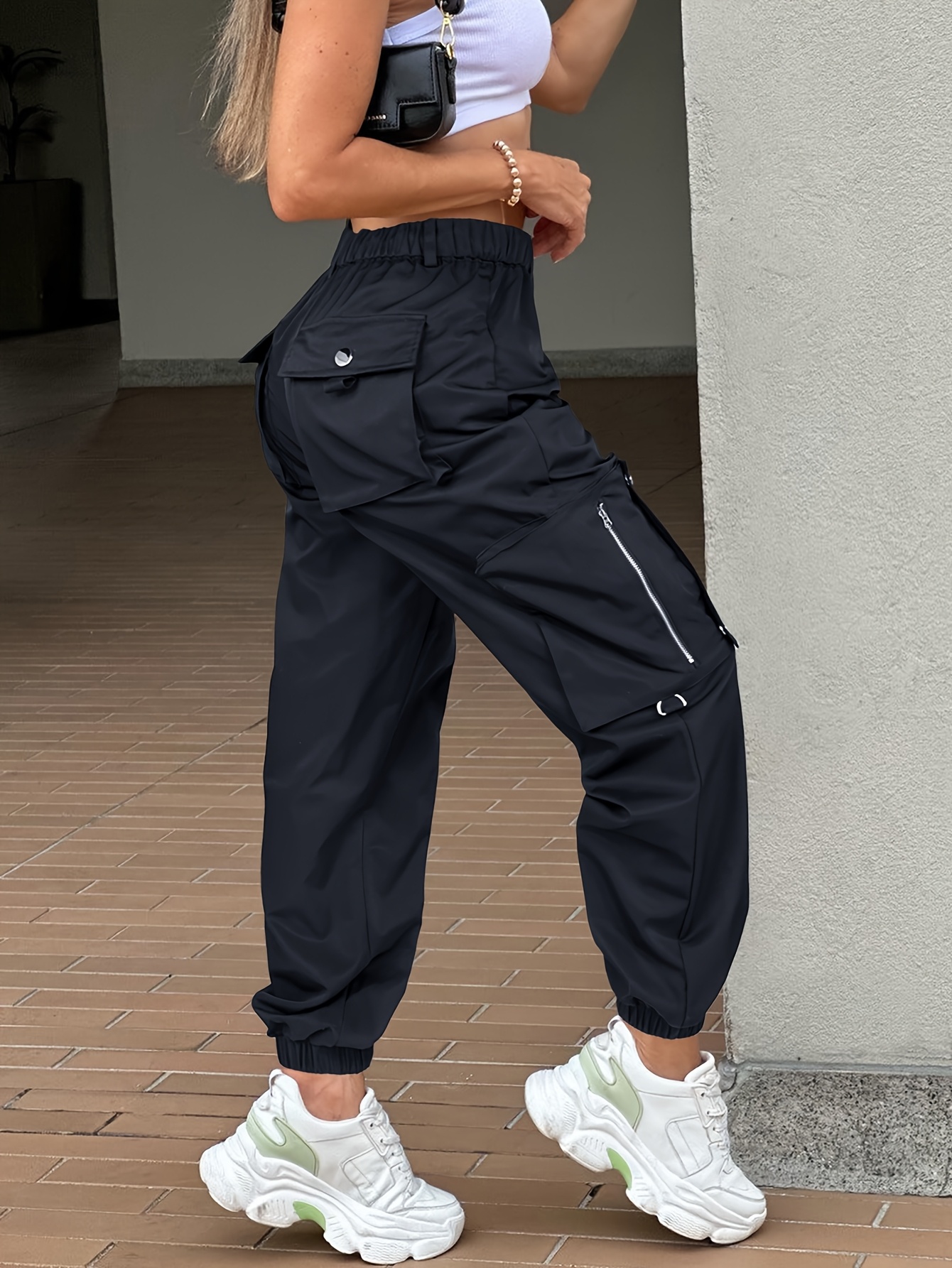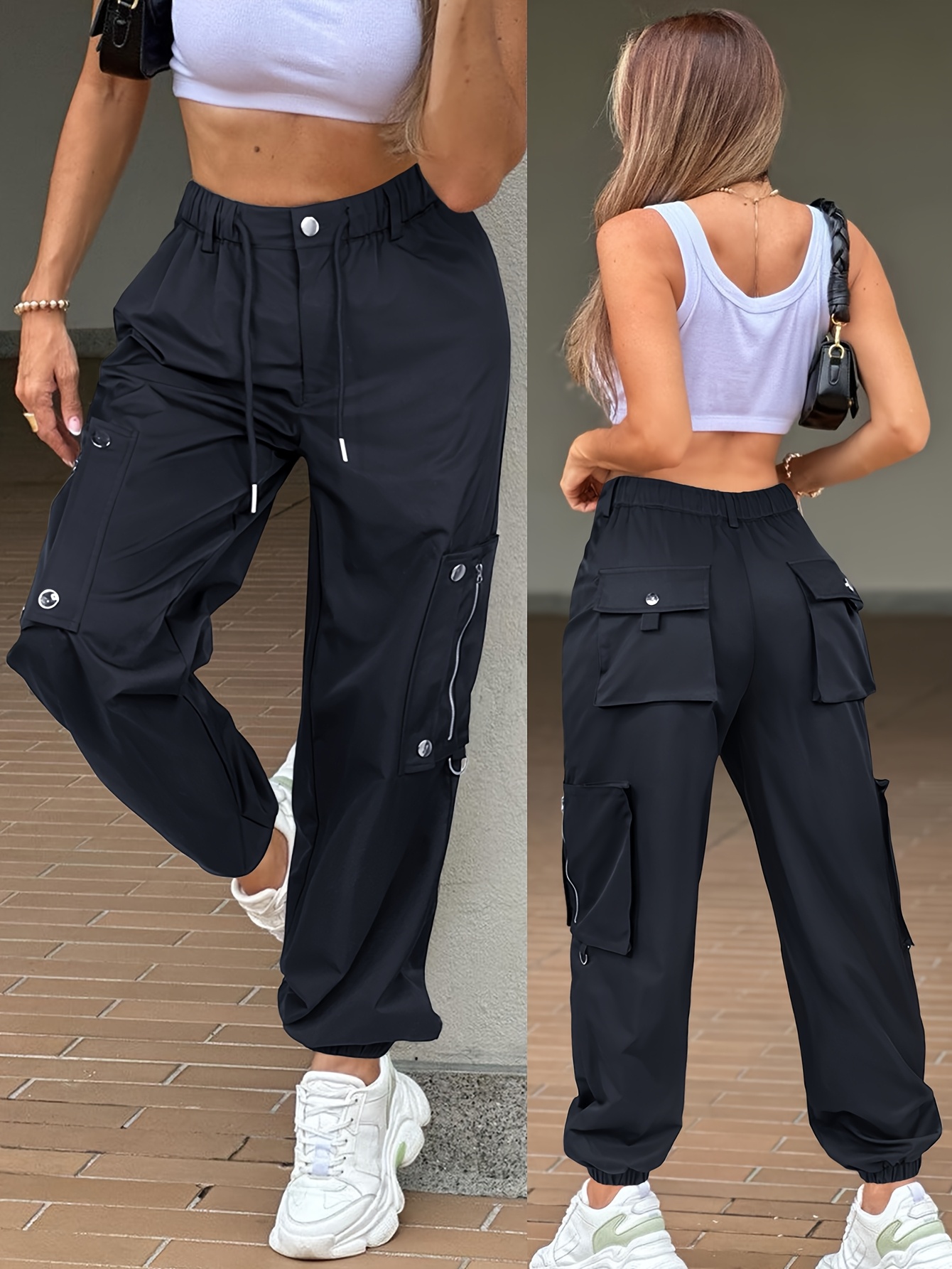 Women's High Waist Side Pocket Cargo Pants, Casual Solid Black, Multi-Zipper Design, Polyester, Daily Commuting Wear, Women's Pants