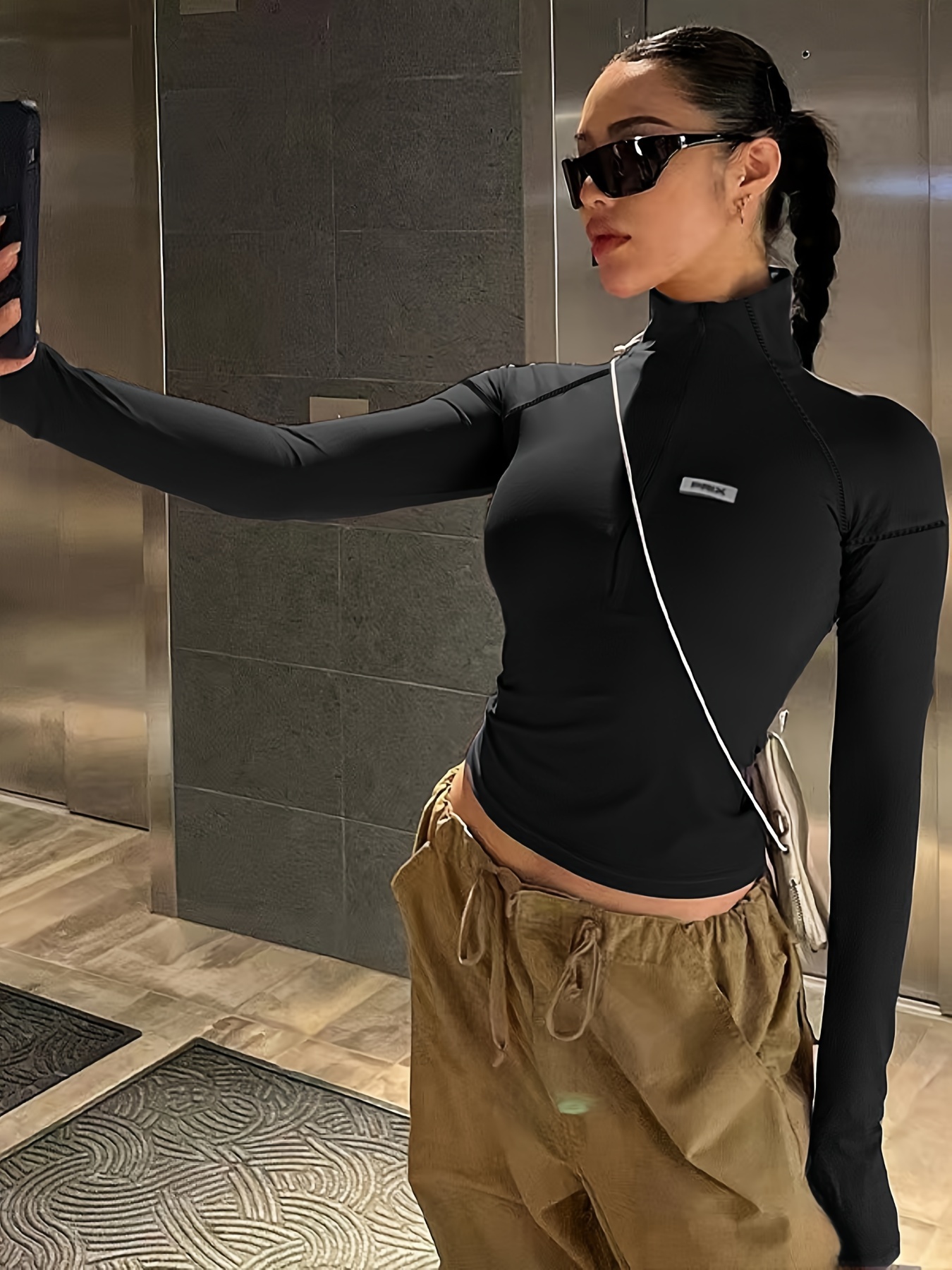 Women's Y2g Style Turtleneck Zipper Long Sleeve Crop Top, Polyester 95% Retractable 5% Knitted Fabric, Solid Color Slim Fit Short Sleeve Shirt, Suitable for Spring and Autumn