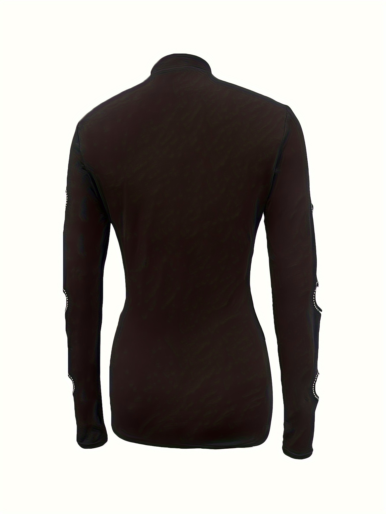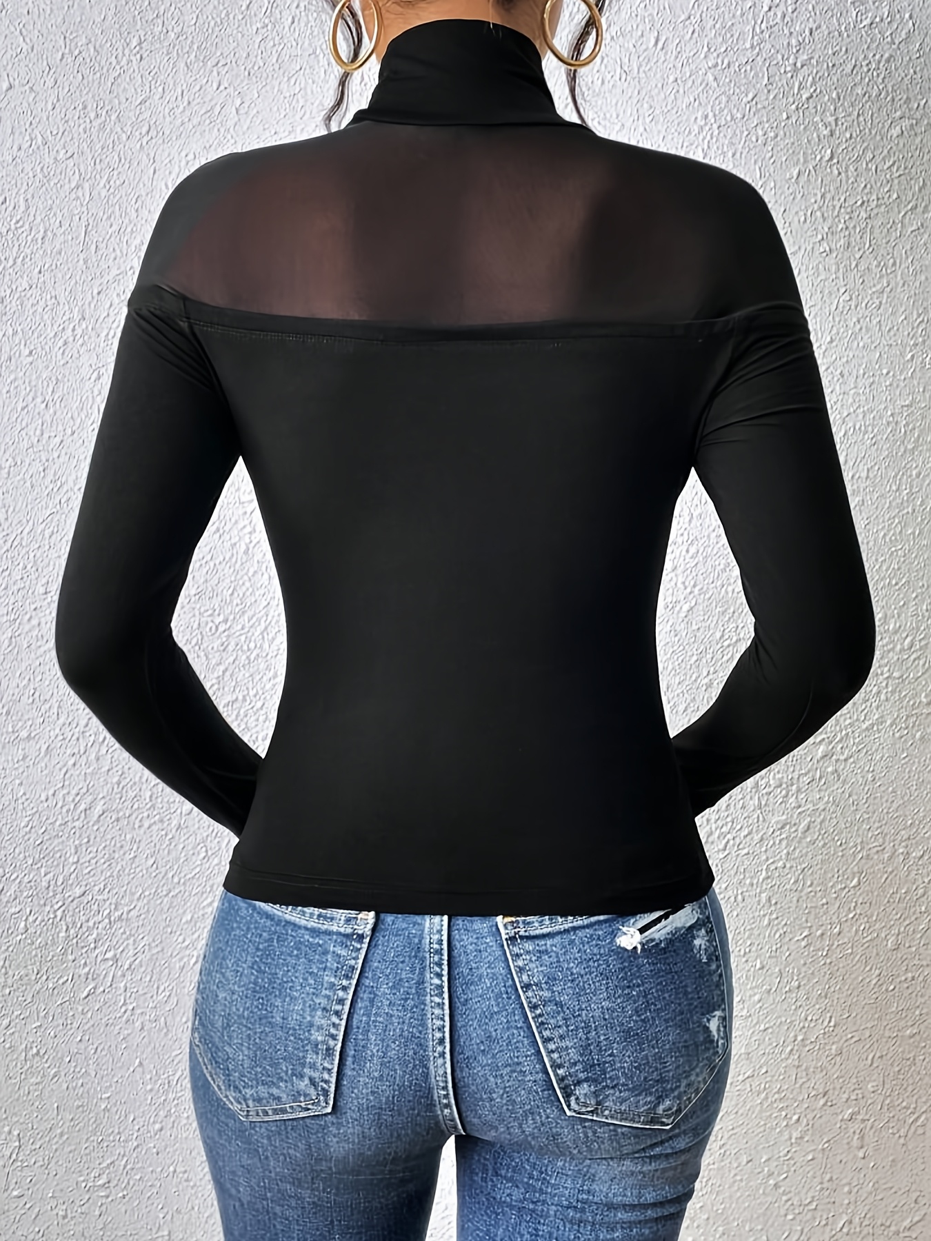 Elegance Black High Neck Long Sleeves T-Shirt with Transparent Mesh Details, 100% Polyester, Machine Washable - Perfect for Spring/Summer, Elegance Style Grids, Spring/Summer