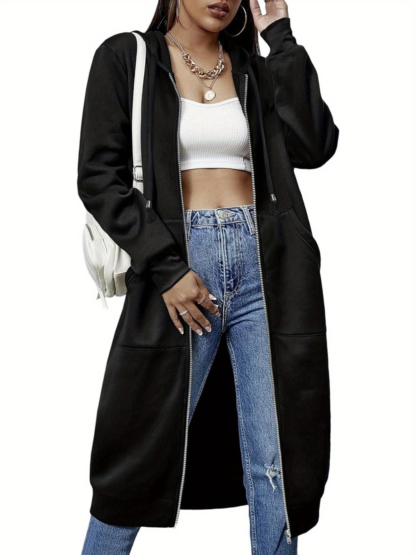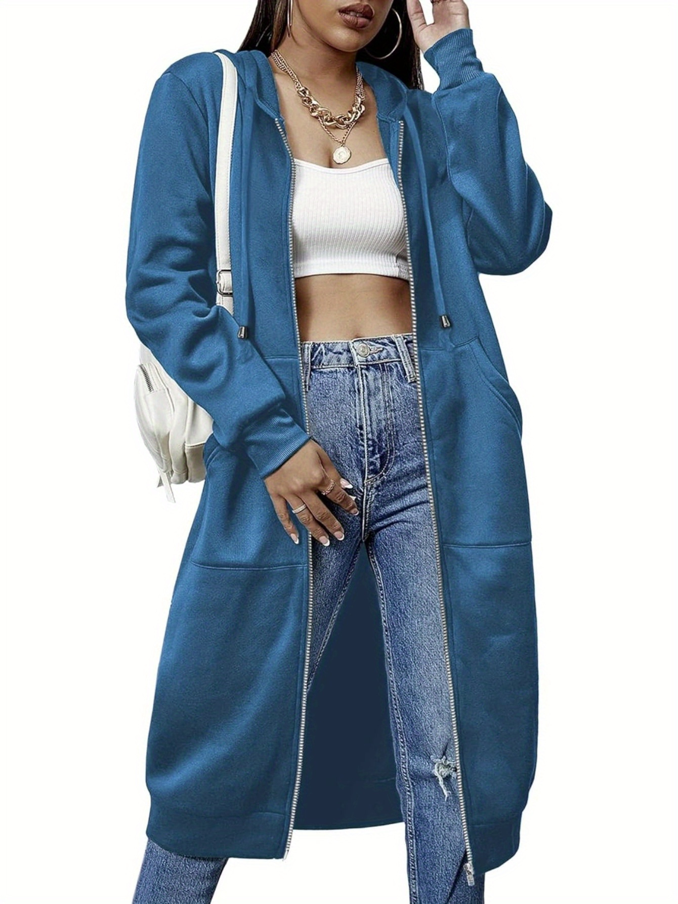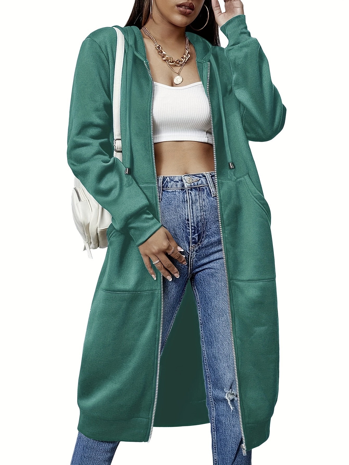 Women's Chic Green Zipper Fleece Hoodie-Casual Long Tunic Jacket with Pockets, Polyester Fiber and Spandex Blend, Suitable for Spring and Autumn, Spring Hoodie | Hoodie | Polyester Fiber Blend, Sweater Hoodie