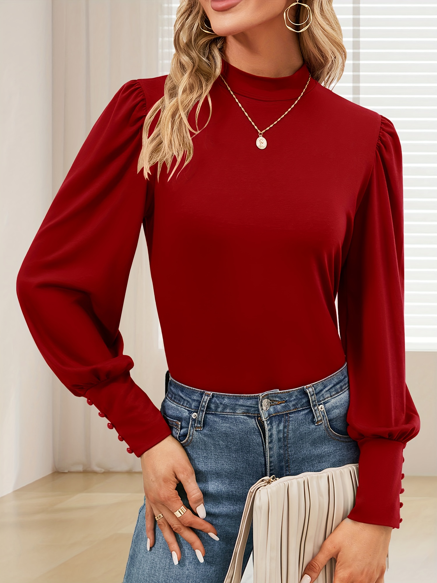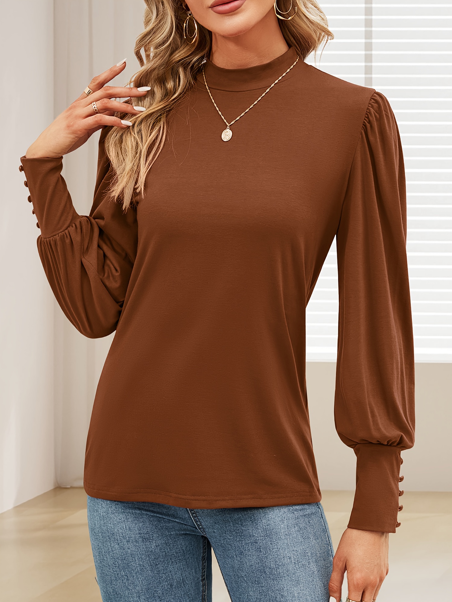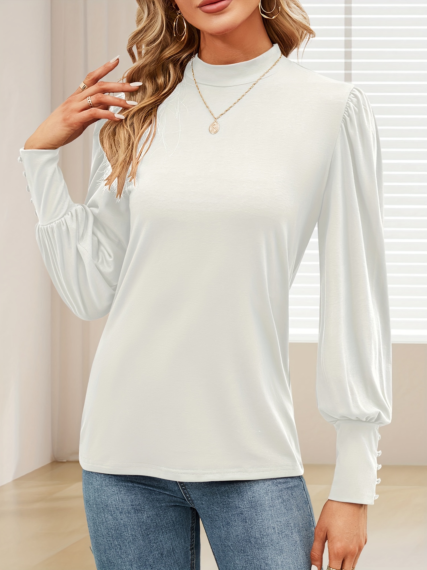 Women's Faux Collar Bubble Long Sleeve Top Casual Loose Solid Color Basic T-shirt Button Cuff Pullover Shirt Women
