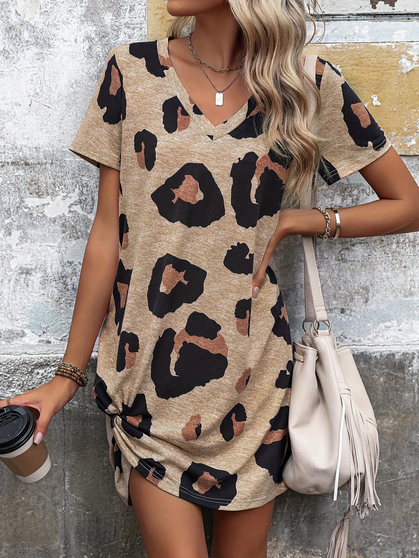 An elegant V-neck leopard print long dress with a twisted hem detail, made of polyester knit fabric, suitable for adults in the spring and summer collection