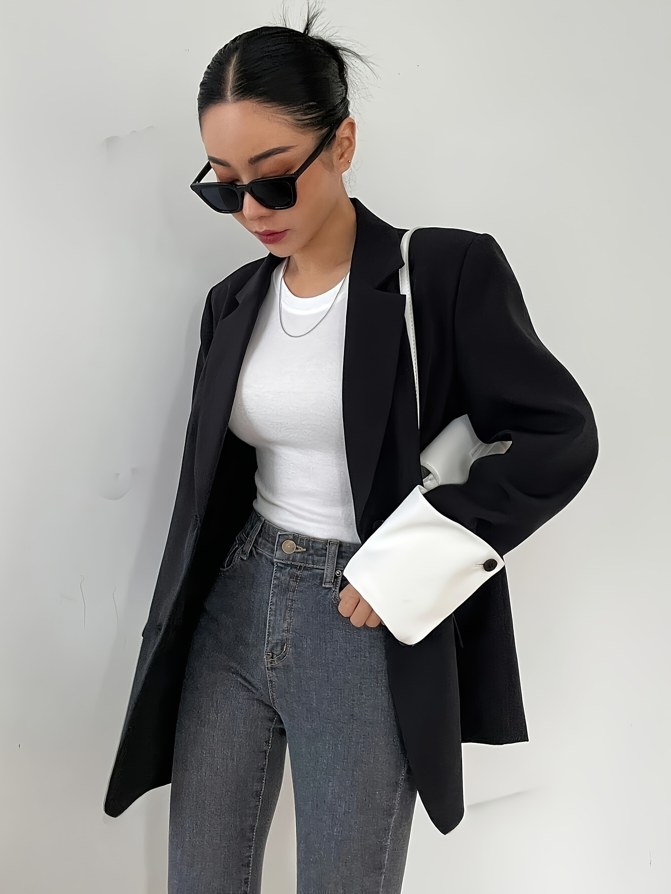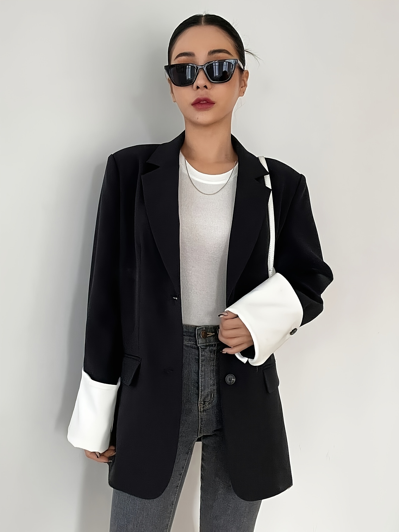 1 piece blue blazer, women's casual solid color long sleeve, polyester blend, loose fit, button front, regular length, non-waterproof, 200g/m² lining weight