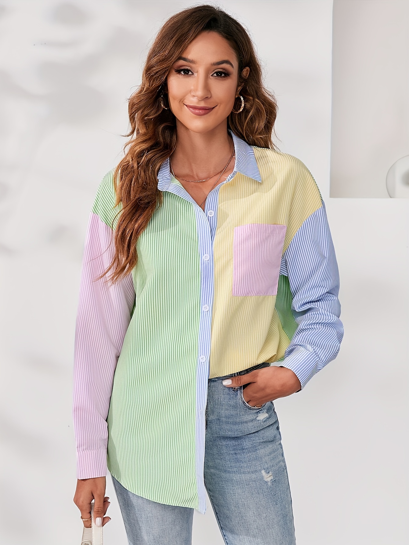 Casual Color Stitching Pattern Polyester Shirt, loose Version, Button Front Opening, Suitable for Daily Wear