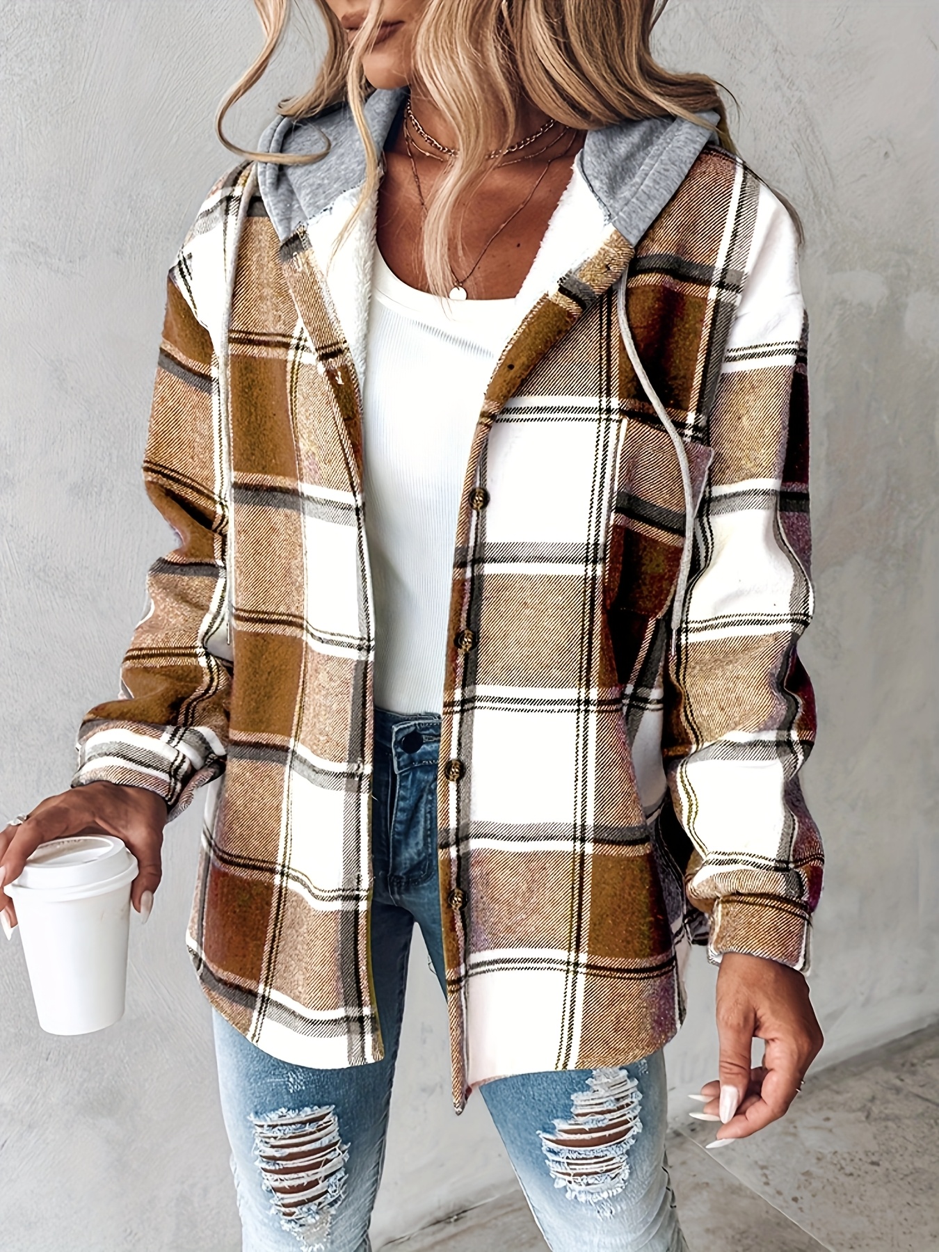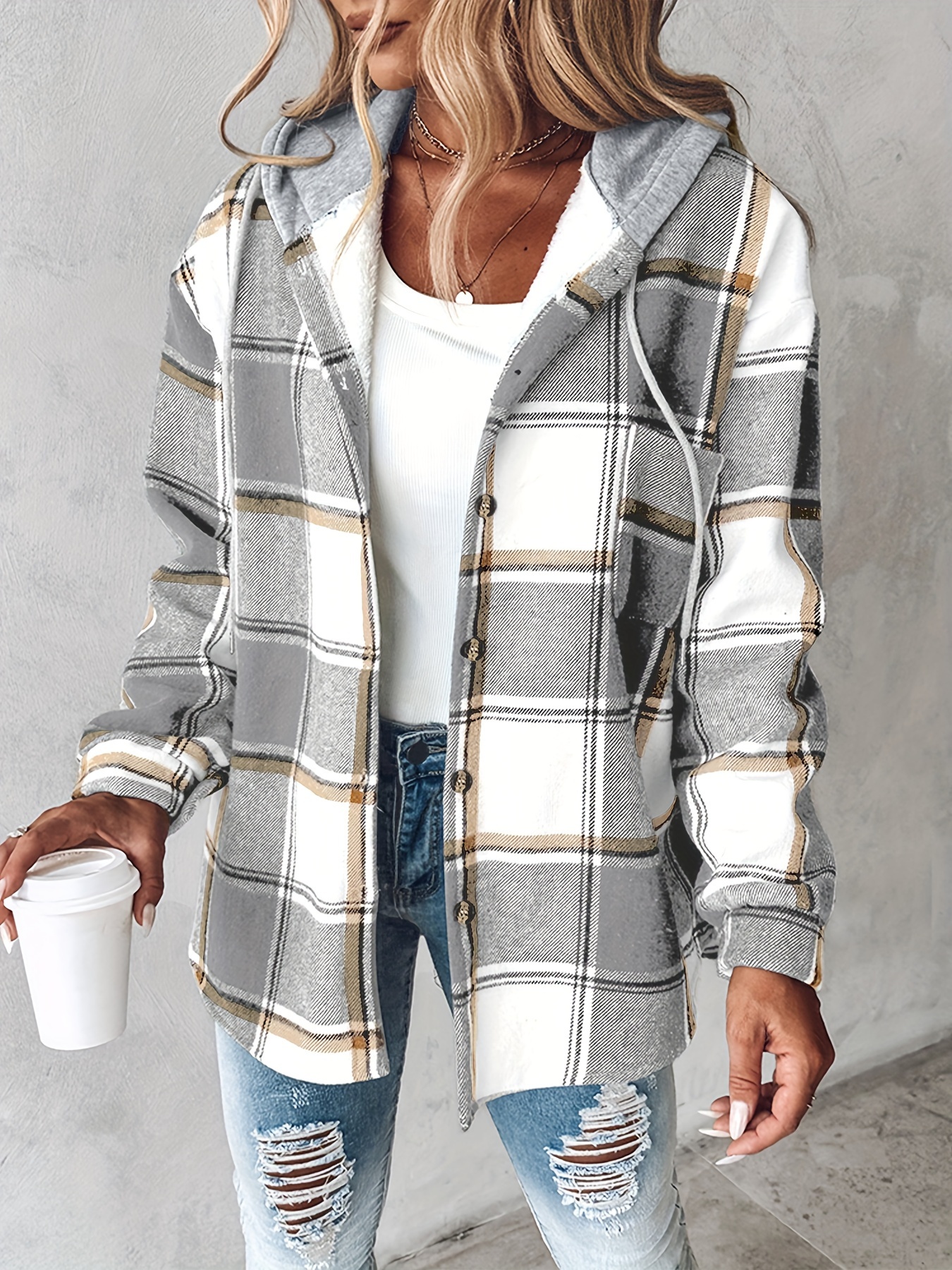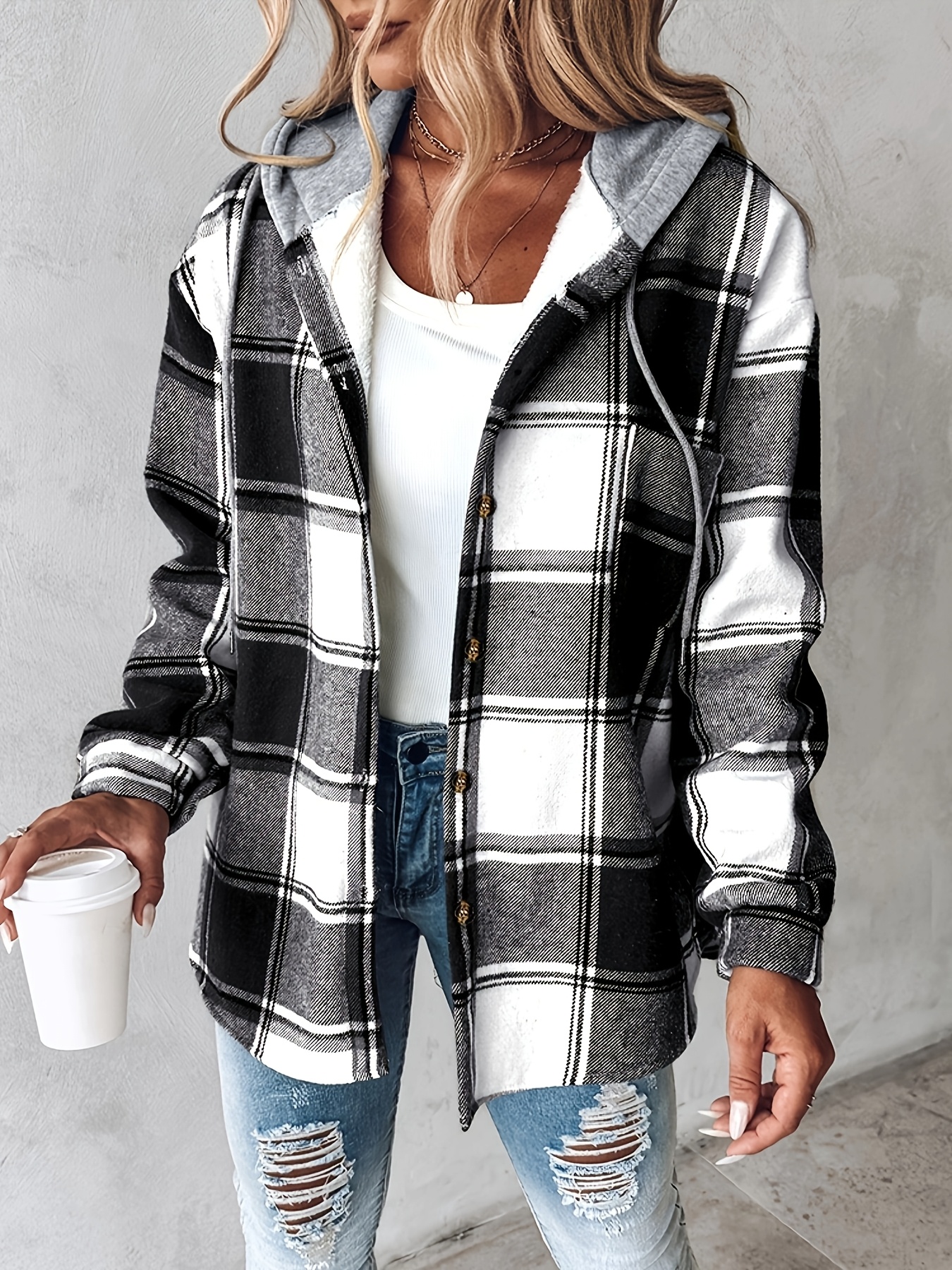 Plaid Pattern Long Sleeve Shirt Button Fleece Lined Hooded Jacket Warm Coat