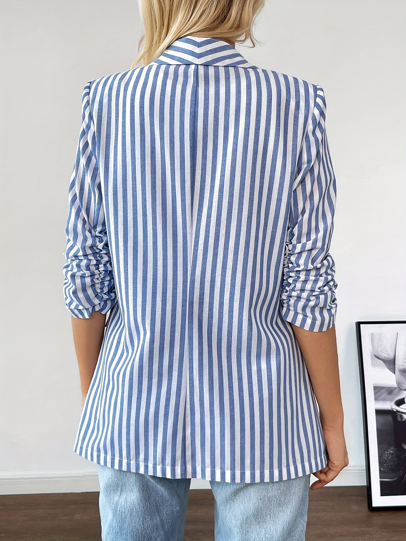 Elegant Women's Striped Jacket with Pleated Cuffs-Polyester Fiber, Machine Washable, Opaque, Cardigan, 3/4 Sleeve, Suitable for Work and Casual Wear