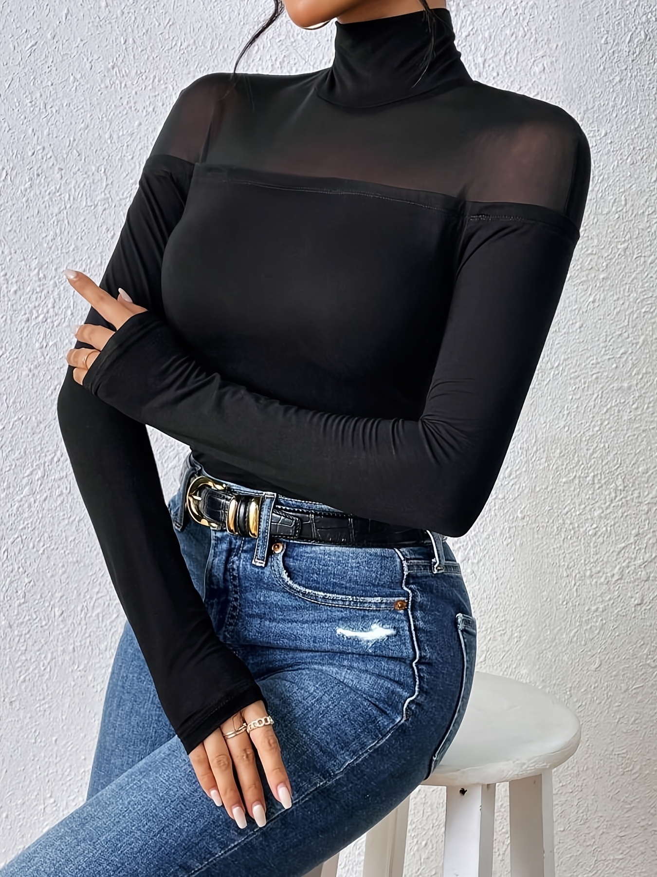 Elegance Black High Neck Long Sleeves T-Shirt with Transparent Mesh Details, 100% Polyester, Machine Washable - Perfect for Spring/Summer, Elegance Style Grids, Spring/Summer