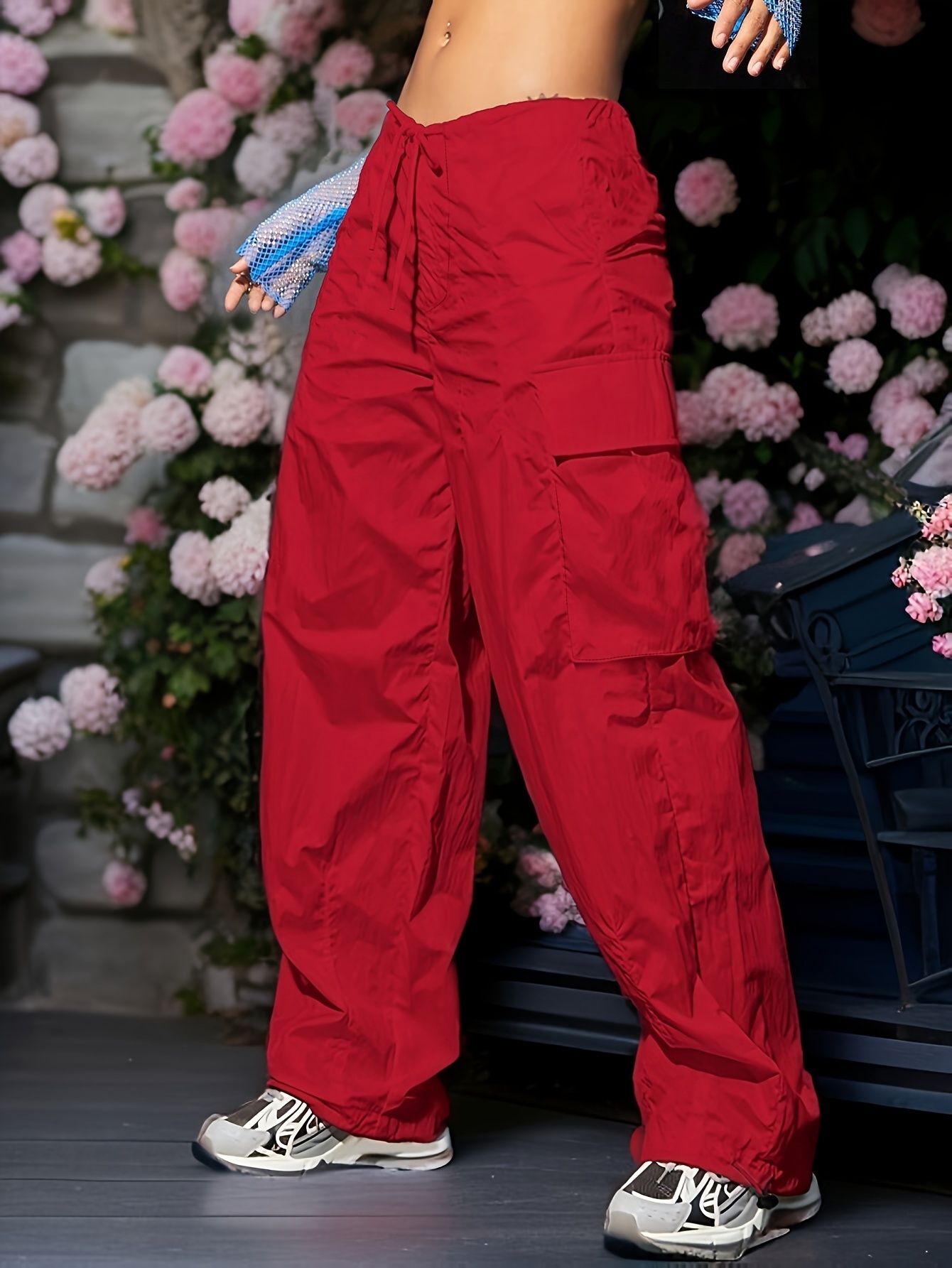 NVFelix Women's Retro Cargo Pants, Casual Fashion All-Season Polyester 100% Solid Color, Non-Elastic Fabric, Collarless Design, Multiple Pockets, Drawstring, Y2K Street Style, Weekend Casual Jumpsuit