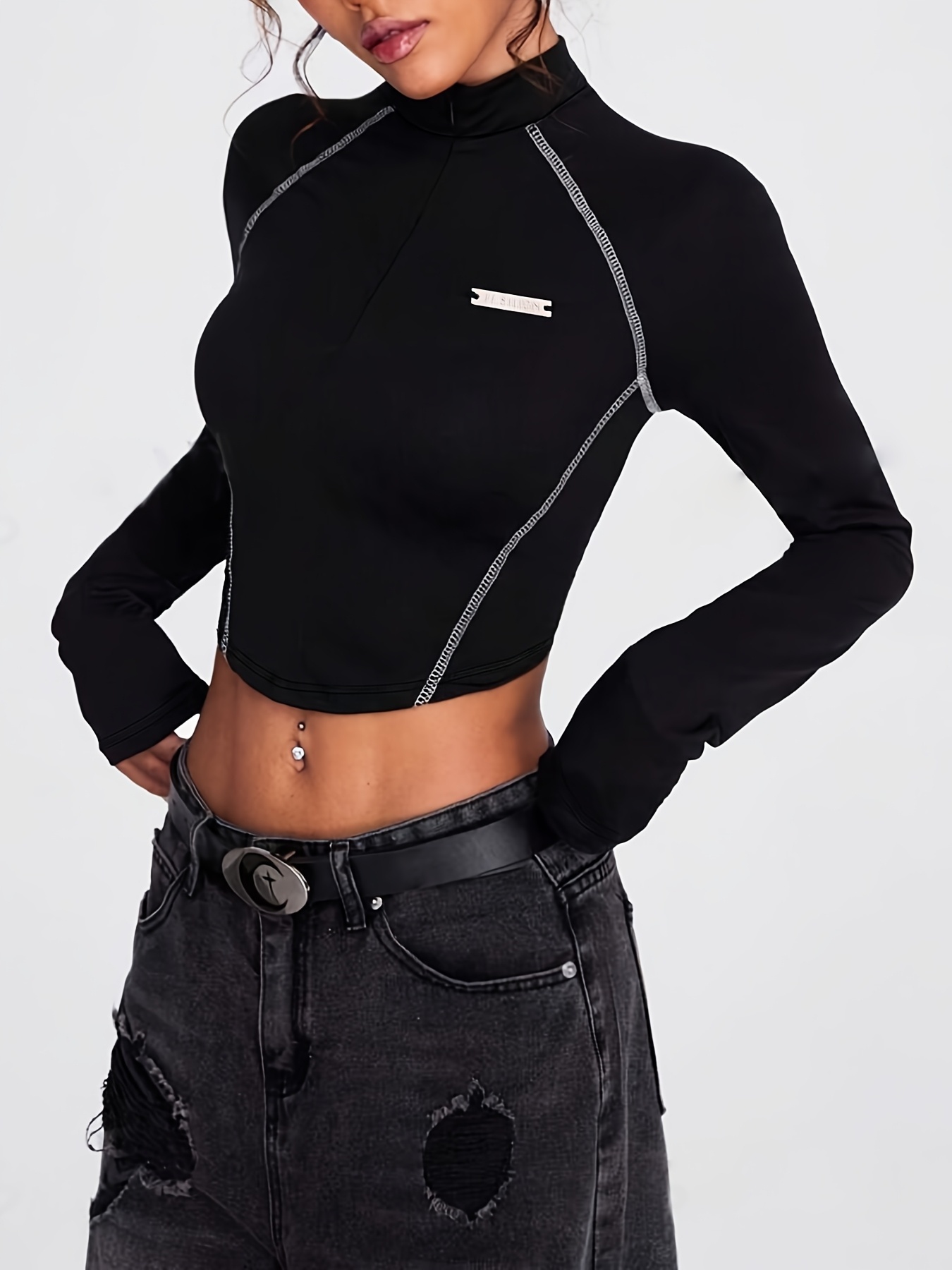 Women's Casual Polyester Knit Long Sleeve Macron Collar T-Shirt - All-Season Solid Color Slim Fit Round Neck Top