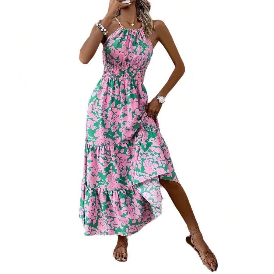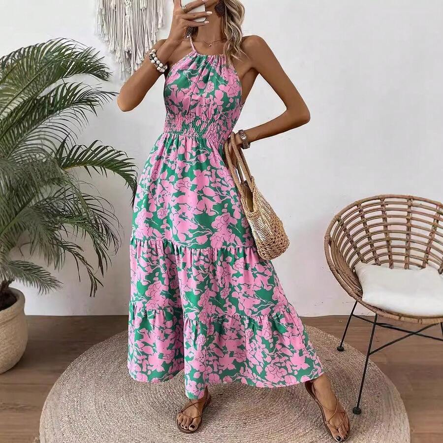 Women's Halter Neck Floral Maxi Dress Sleeveless Smocked Waist Flowy Vacation Beach Dress